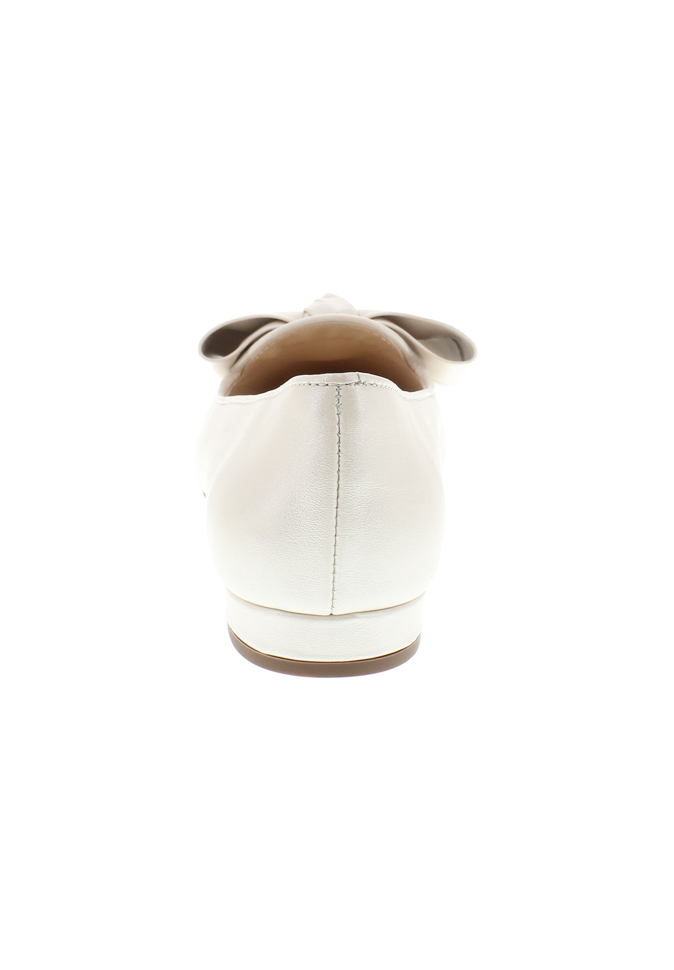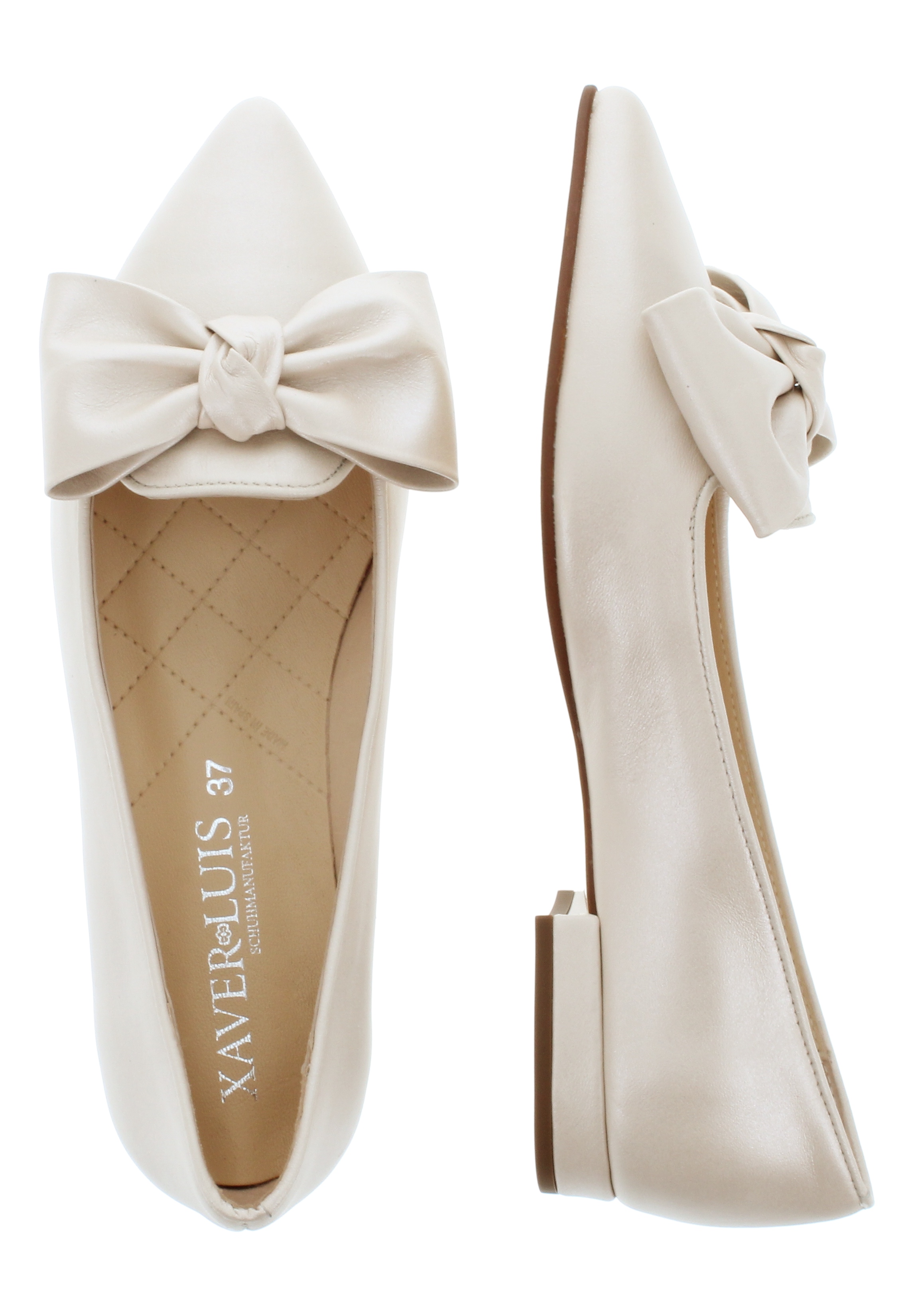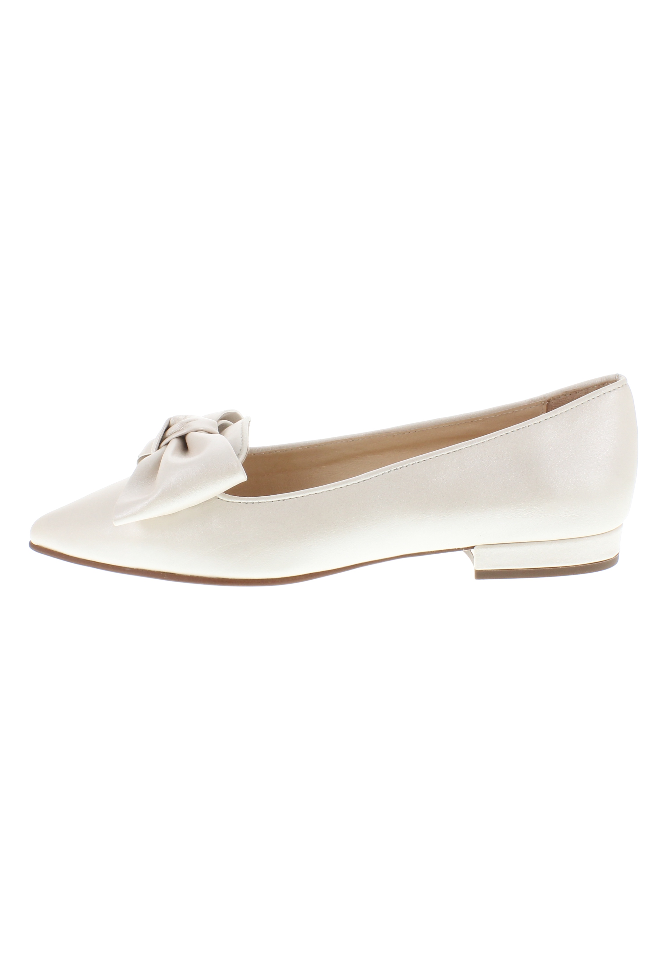 Neben richtig hohen Pumps sind auch flachere Schuhe, die sehr gut zu einem Kleid oder Dirndl kombiniert werden können, erhältlich. Diese spitzen Ballerinas "COCOS" mit einer auffällig großen Schleife sind besonders feminine Brautschuhe.